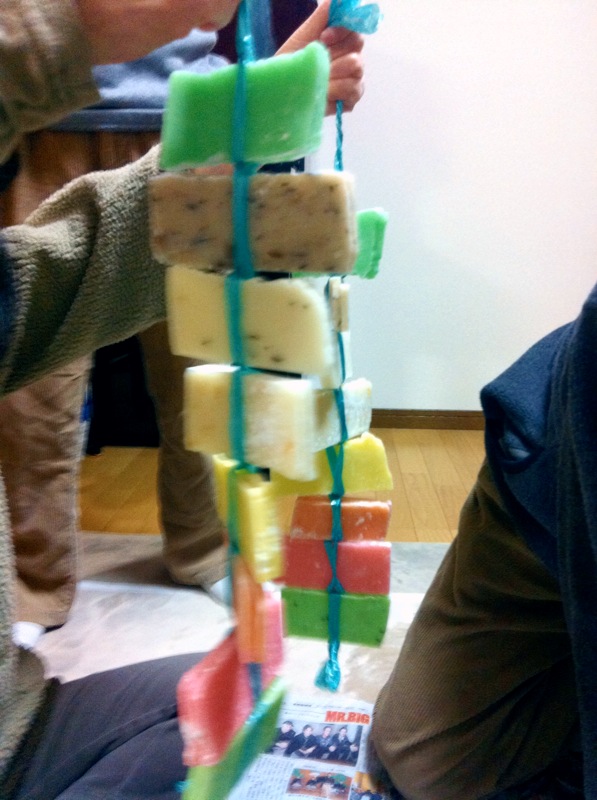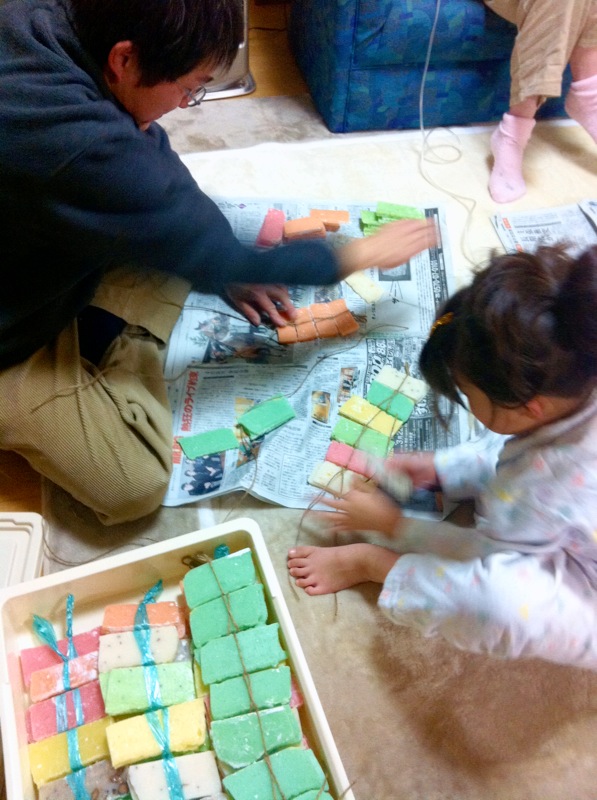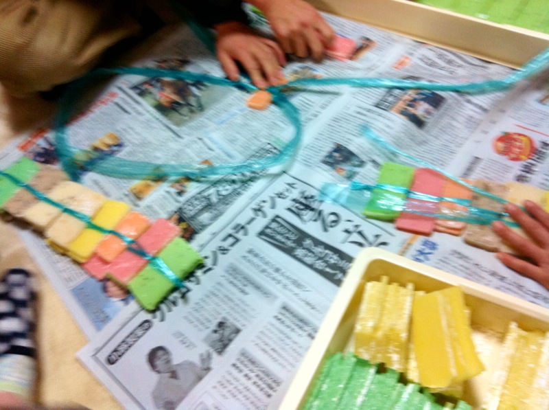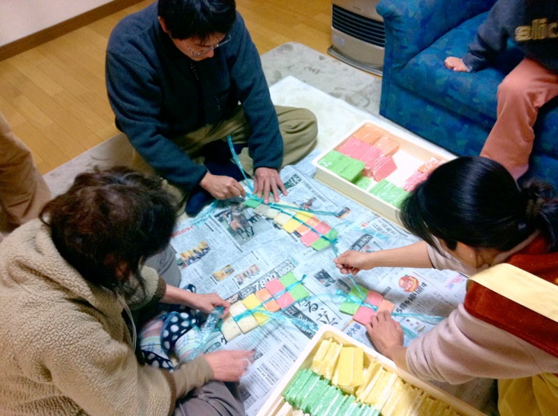 薄く切ったかき餅をビニール紐や縄に縛っていくのですが、